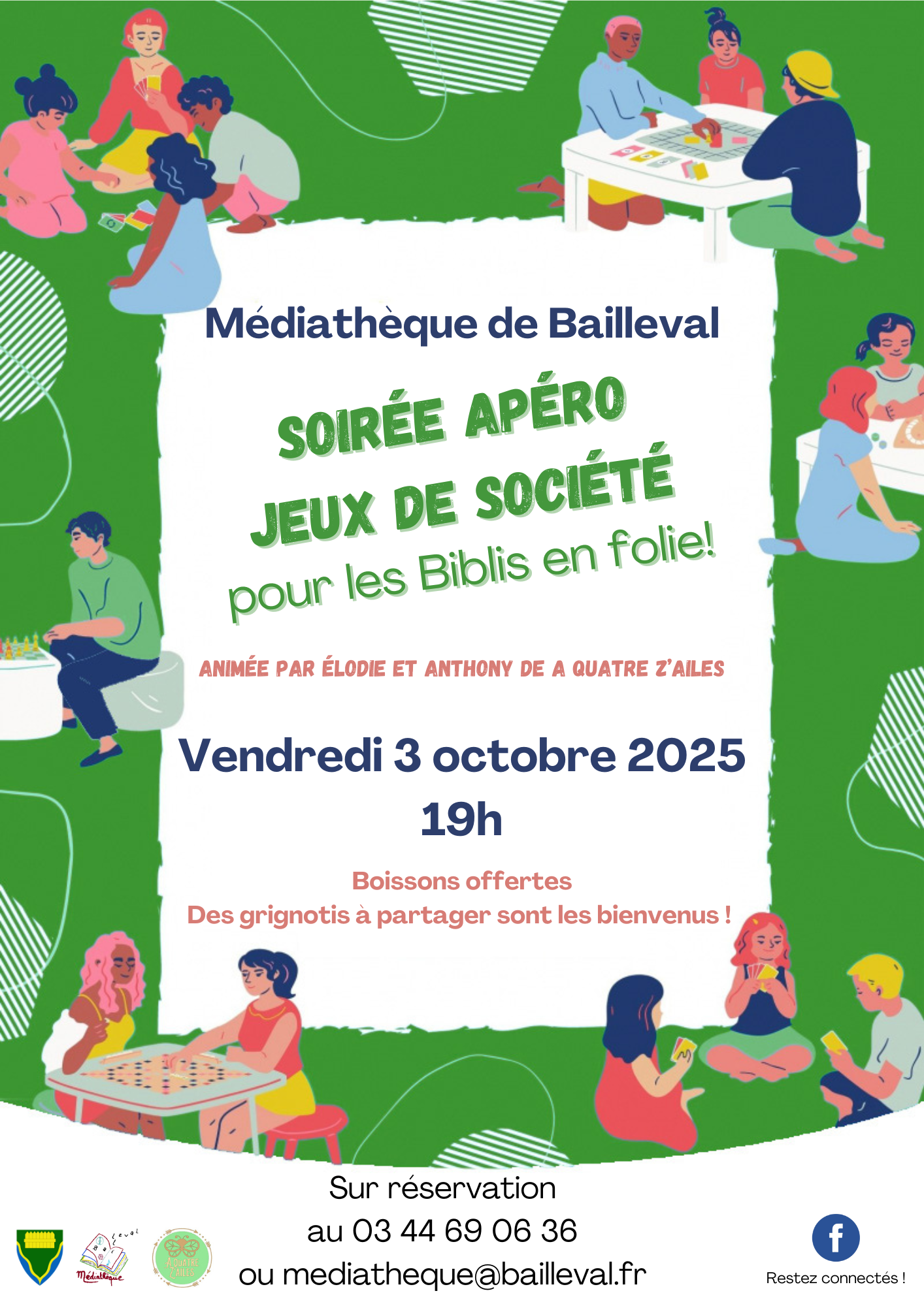 Vendredi 3 octobre 2025 à 19h à la médiathèque : soirée apéro jeux de société