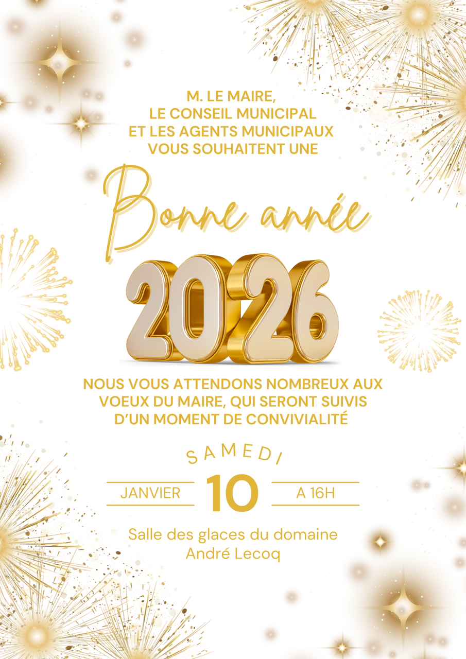 Les voeux du Maire auront lieu le samedi 10 janvier 2026 à 16h à la salle des glaces du Domaine André Lecoq.