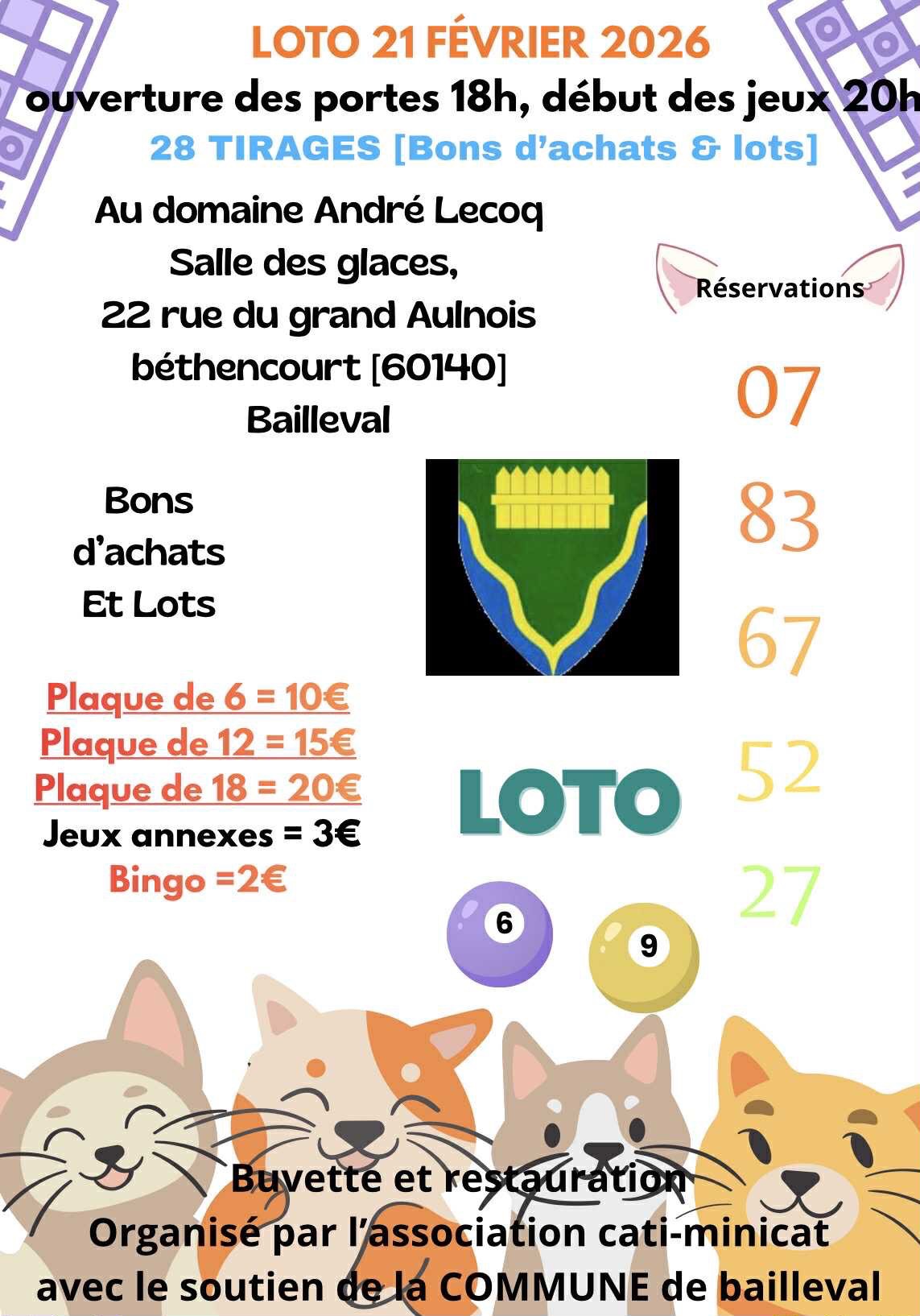 Samedi 21 février 2026 à 20h (ouverture des portes à 18h), l'association CATI-MINICAT vous invite à son premier loto à la salle des glaces du Domaine André Lecoq.